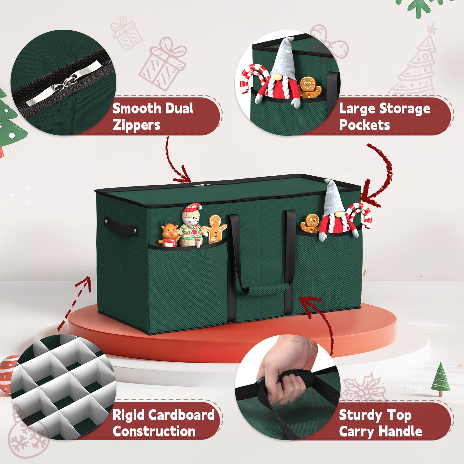 - Convenient Storage Solution: Christmas organizers and storage has 2 sturdy side handles and 2 additional long handles for easy transport of all decorations. A zippered lid that opens fully, while the stackable design saves space, ideal for basements, attics, and closets. Not limited to ornaments—store holiday decor, string lights, tree toppers, and other seasonal essentials in one convenient place