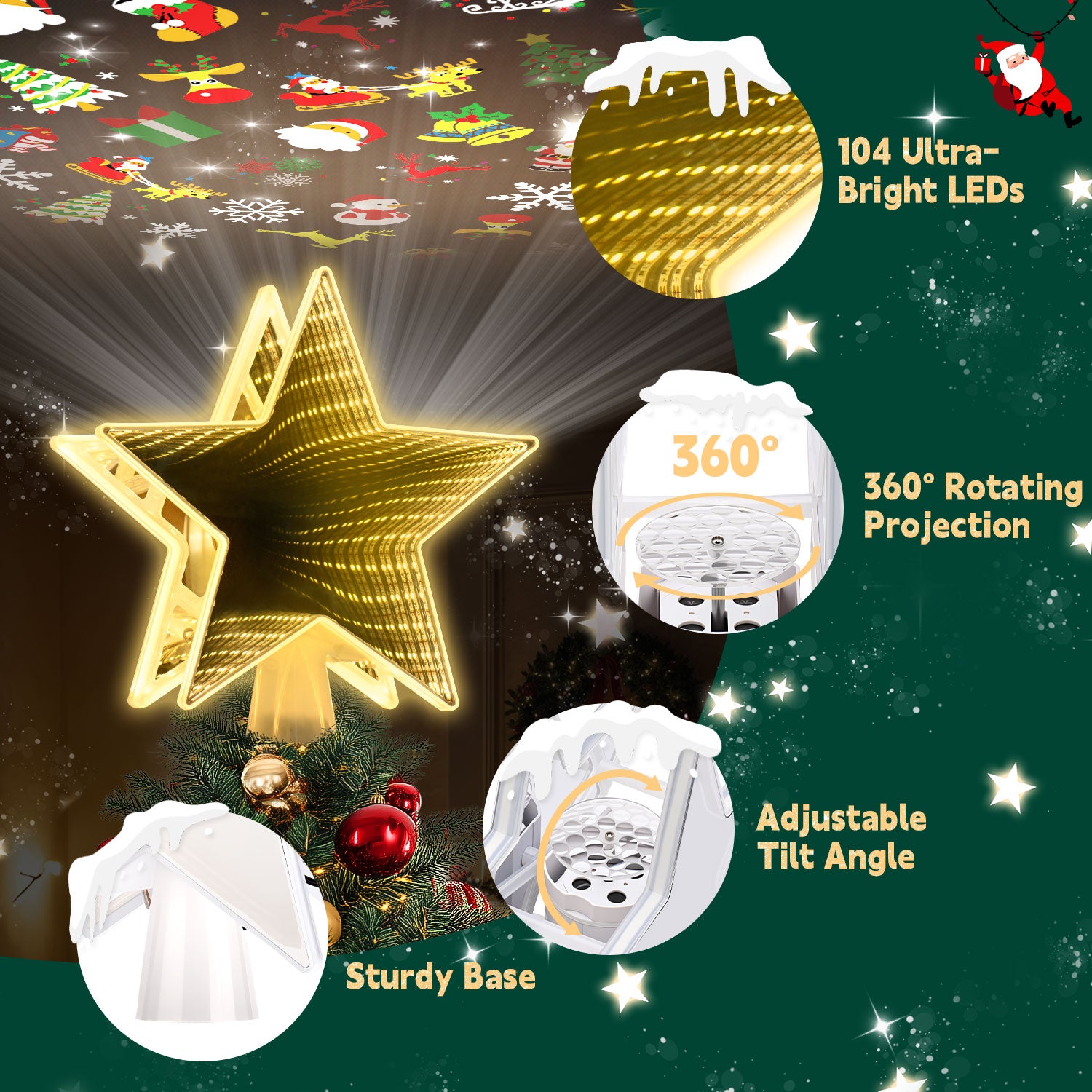 - 3D Tunnel Dynamic Lighting Effect: 104 high-brightness LED lights create a 3D dynamic light tunnel effect, making it the instant visual focus of your entire Christmas tree and drawing all eyes to your tree topper. It achieves the overall effect of "starlight on the treetop + brilliance on the tree body," adding even more holiday atmosphere