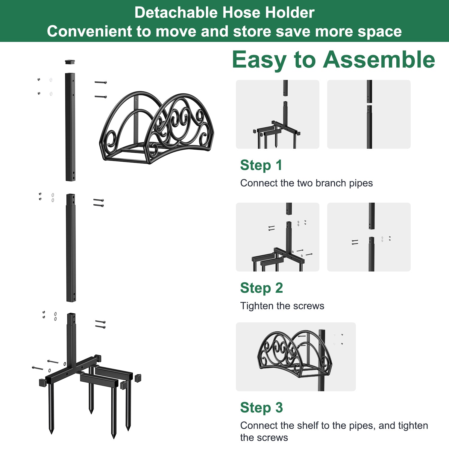 - Detachable and Easy to Assemble: This is a detachable, freestanding hose holder stand that is very convenient for daily use.Unlike wall-mounted hose hangers, This water hose holder can be placed and move easily. And it's also easy to disassemble and space-saving when you do not need it
